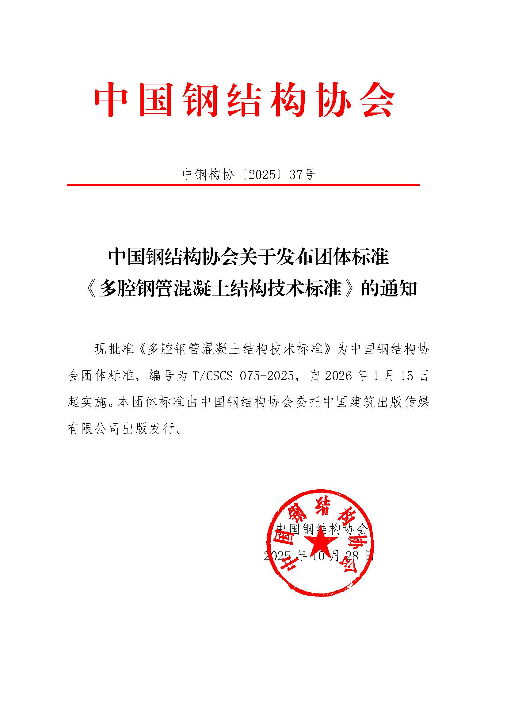 中國鋼結(jié)構(gòu)協(xié)會關(guān)于發(fā)布團體標(biāo)準(zhǔn)《多腔鋼管混凝土結(jié)構(gòu)技術(shù)標(biāo)準(zhǔn)》的通知